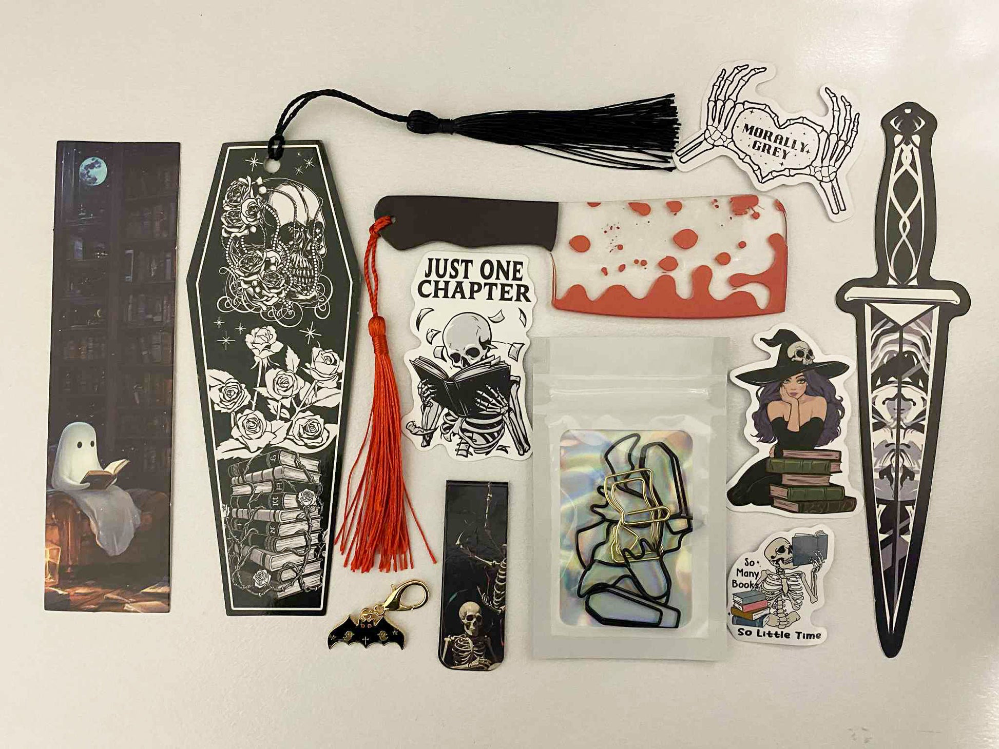 This pack includes 4 bookmarks in total consisting of paper, magnetic and tasseled bookmarks, a pen, a keychain, a paper clip pack and a sticker pack!